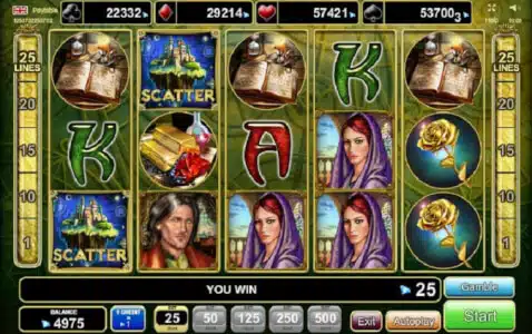 - Het kasteel – Het kasteel is het scatter symbool. Bij drie scatter symbolen win je 2.500 muntjes en 7 free spins. Een prima deal als je het ons vraagt. Tijdens de free spins kun je nog eens extra free spins winnen.